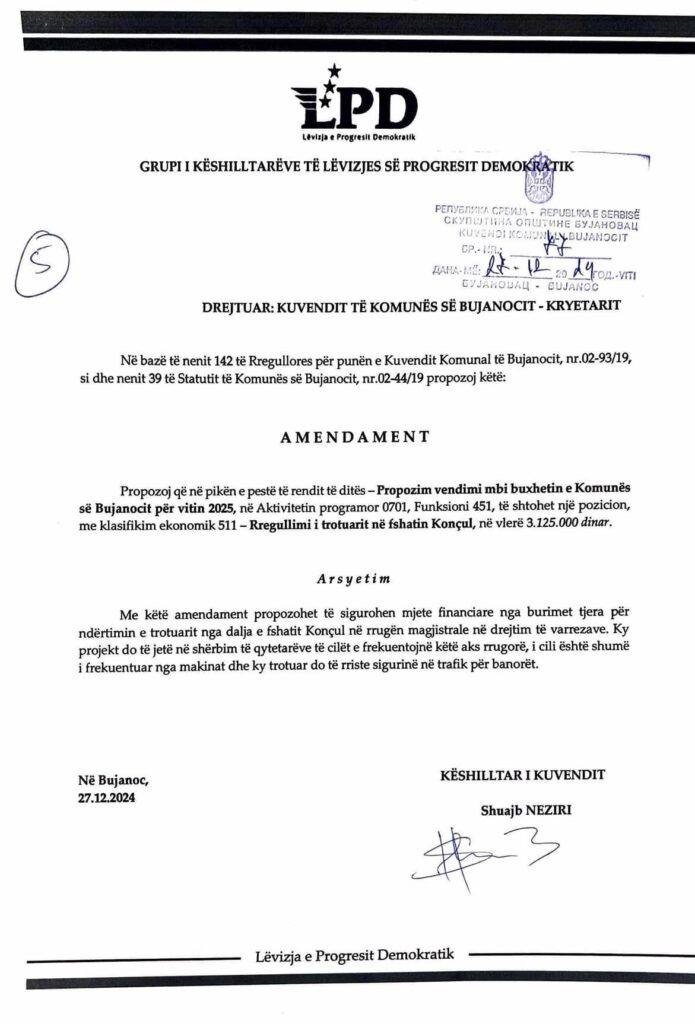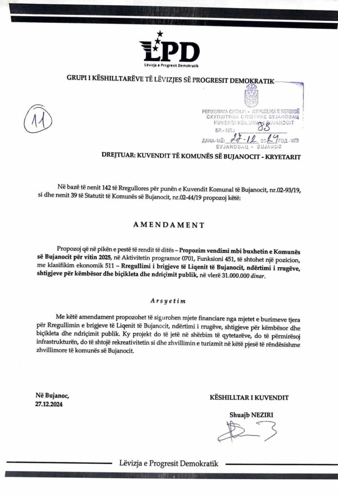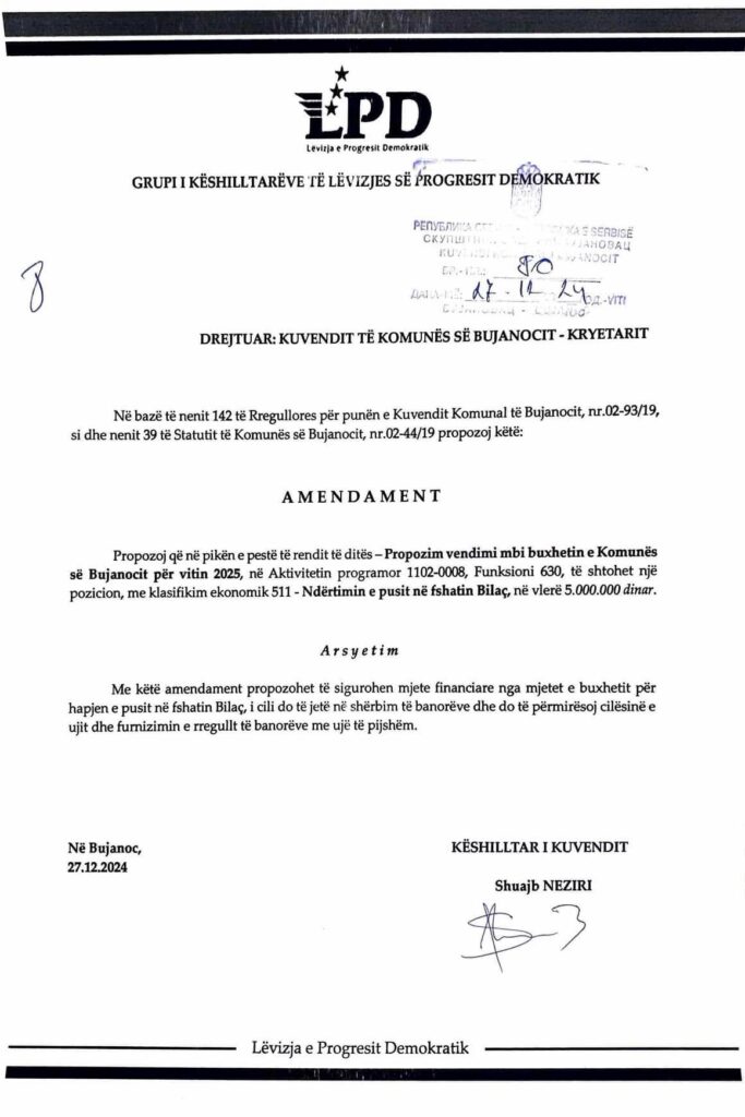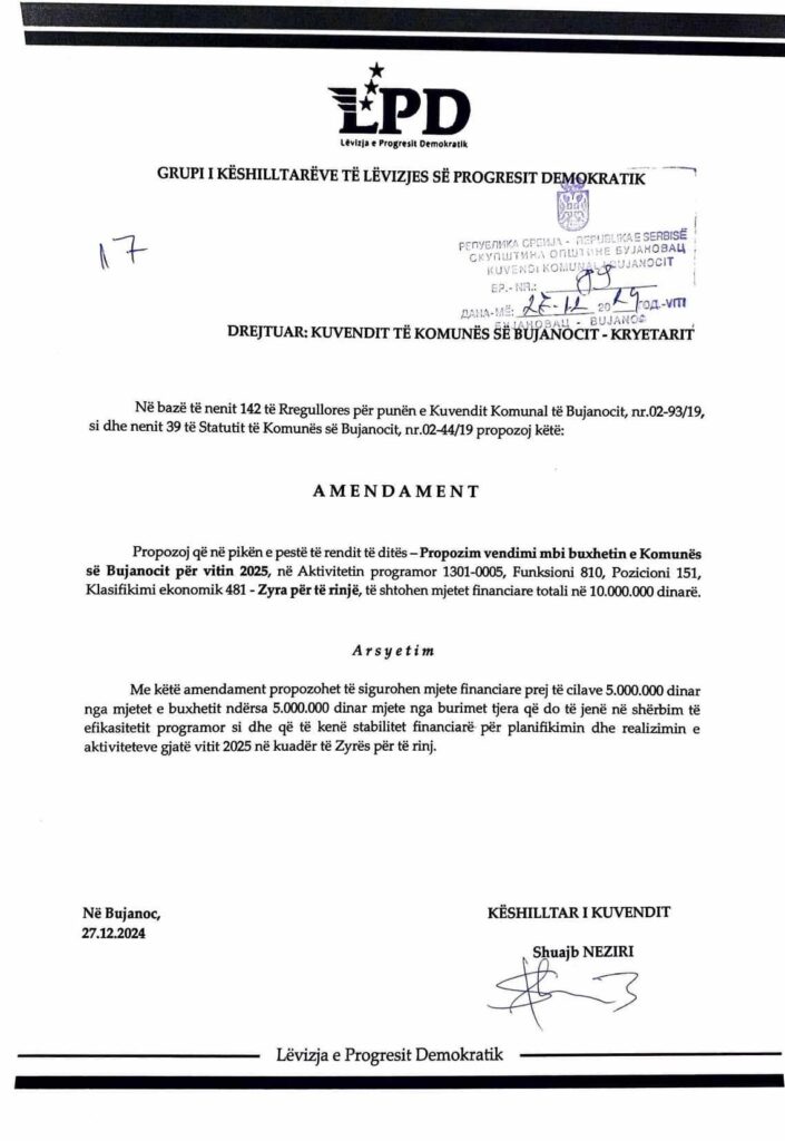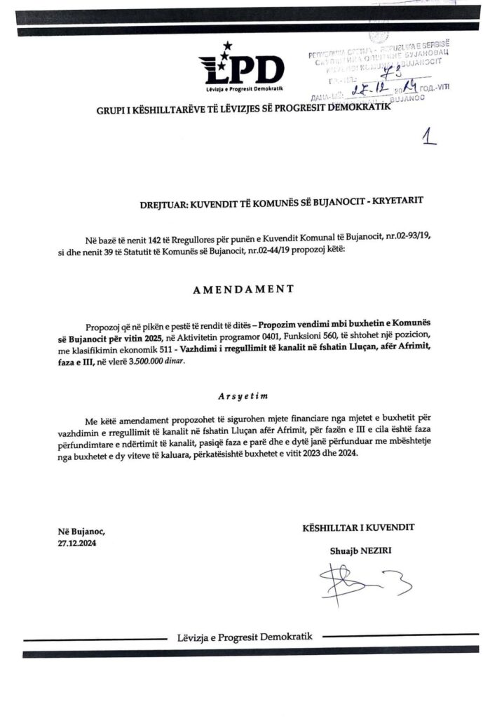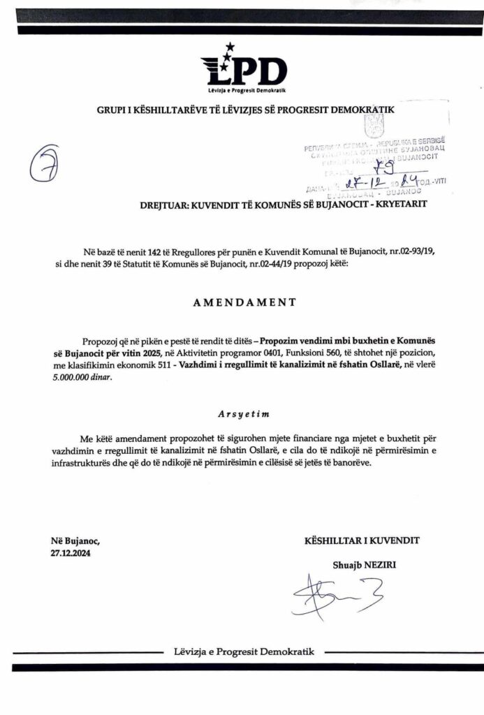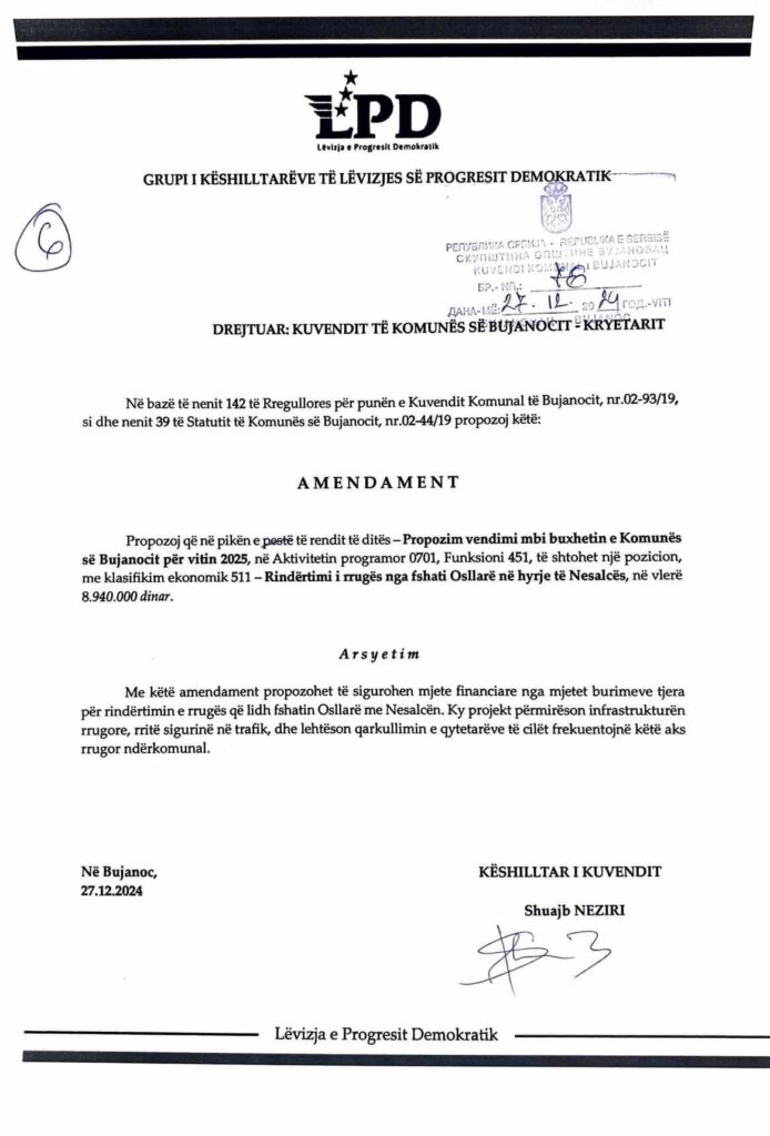 Grupi i këshilltarëve të LPD-së, ka propozuar 22 amendamente të cilat kanë të bëjnë me prioritete të rëndësishme ndaj qytetarëve të cilat përfshijnë fusha të ndryshme e vendbanime të rëndësishme shqiptare.