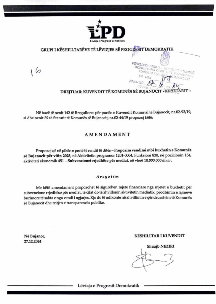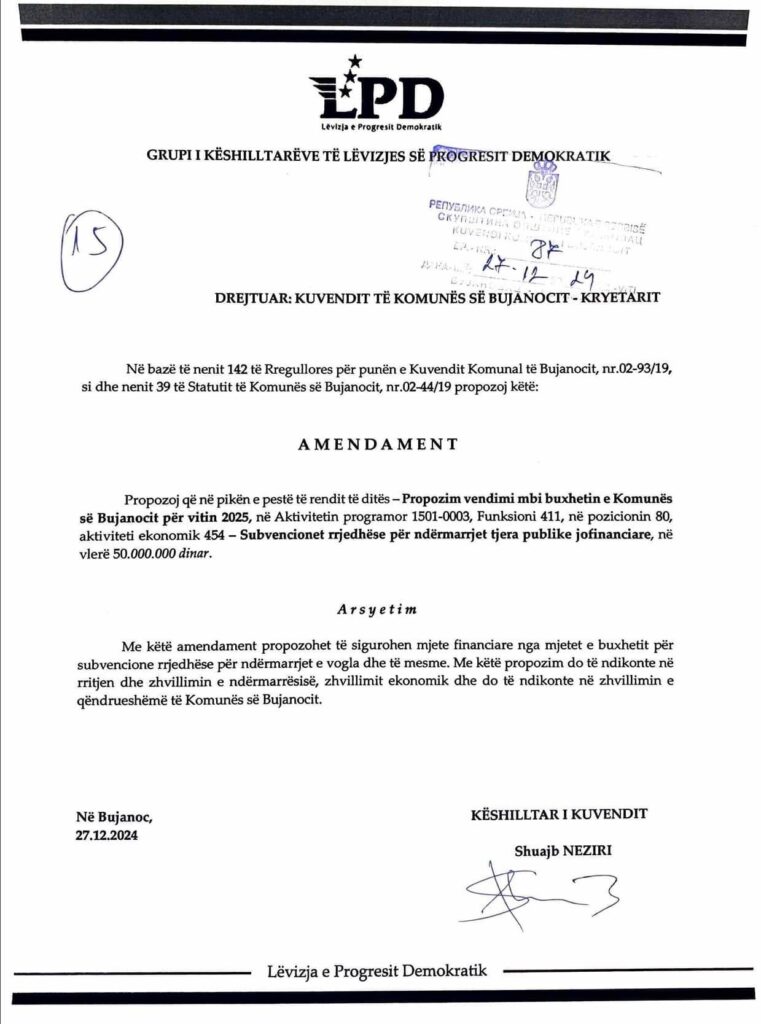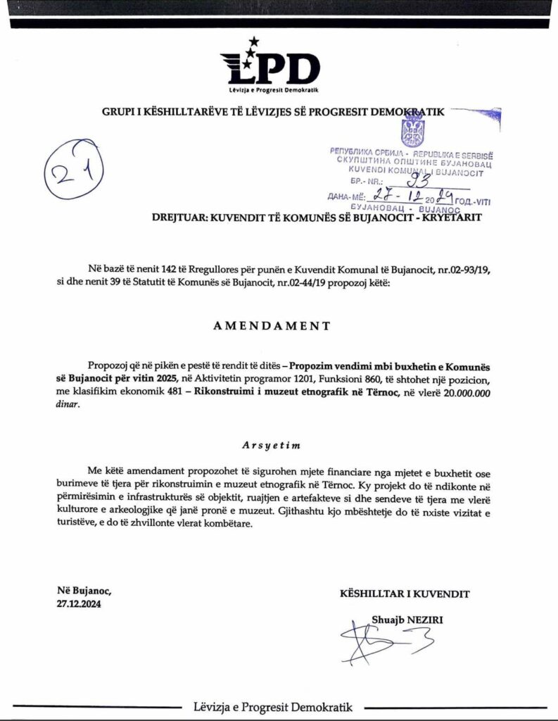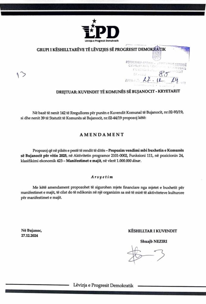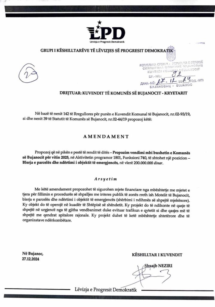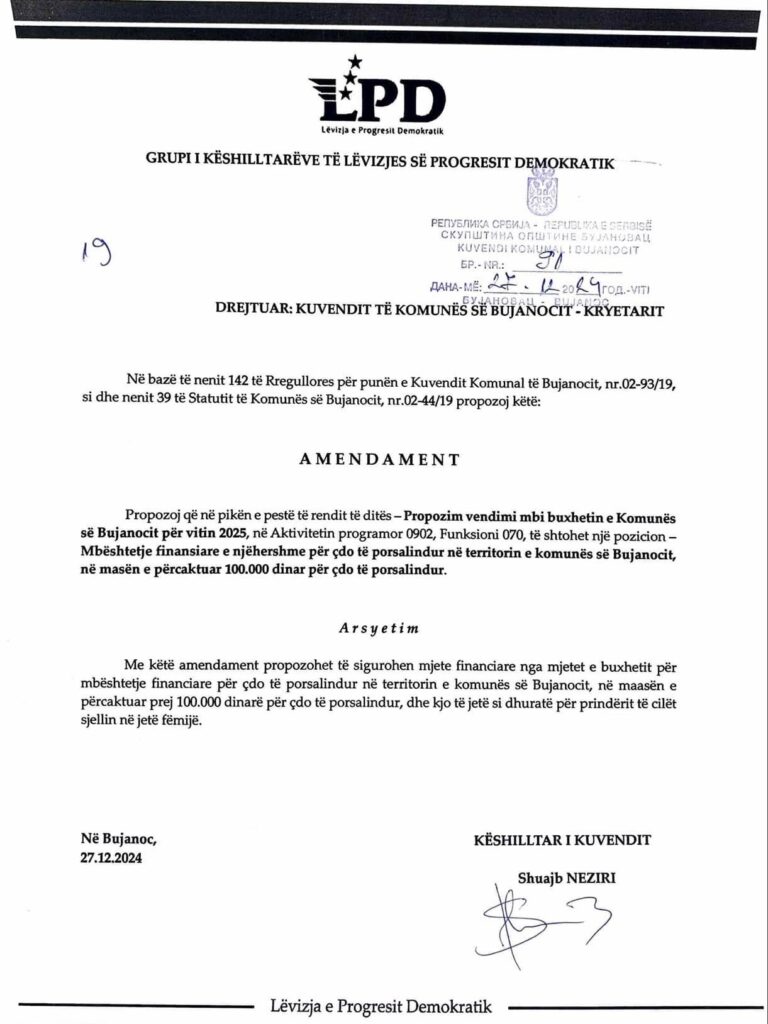 Grupi i këshilltarëve të LPD-së, ka propozuar 22 amendamente të cilat kanë të bëjnë me prioritete të rëndësishme ndaj qytetarëve të cilat përfshijnë fusha të ndryshme e vendbanime të rëndësishme shqiptare.