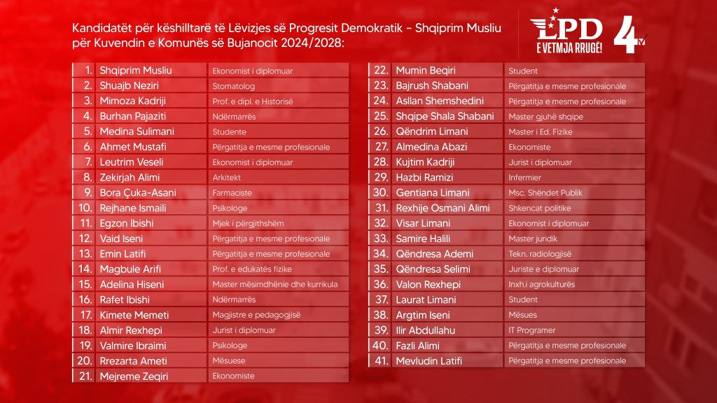 Në zgjedhjet e 2 qershorit edhe zyrtarisht lista jonë fituese është certifikuar me numrin 4 – LËVIZJA E PROGRESIT DEMOKRATIK – Shqiprim Musliu. Votuesit tanë do t’i japin vulë fitores, duke ndjekur listën me numrin 4. Urime për gjithë aktivistët dhe mbështetësit tanë. Na priftë e mbara! Share